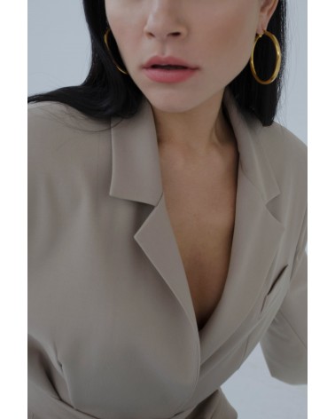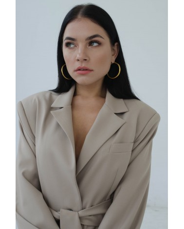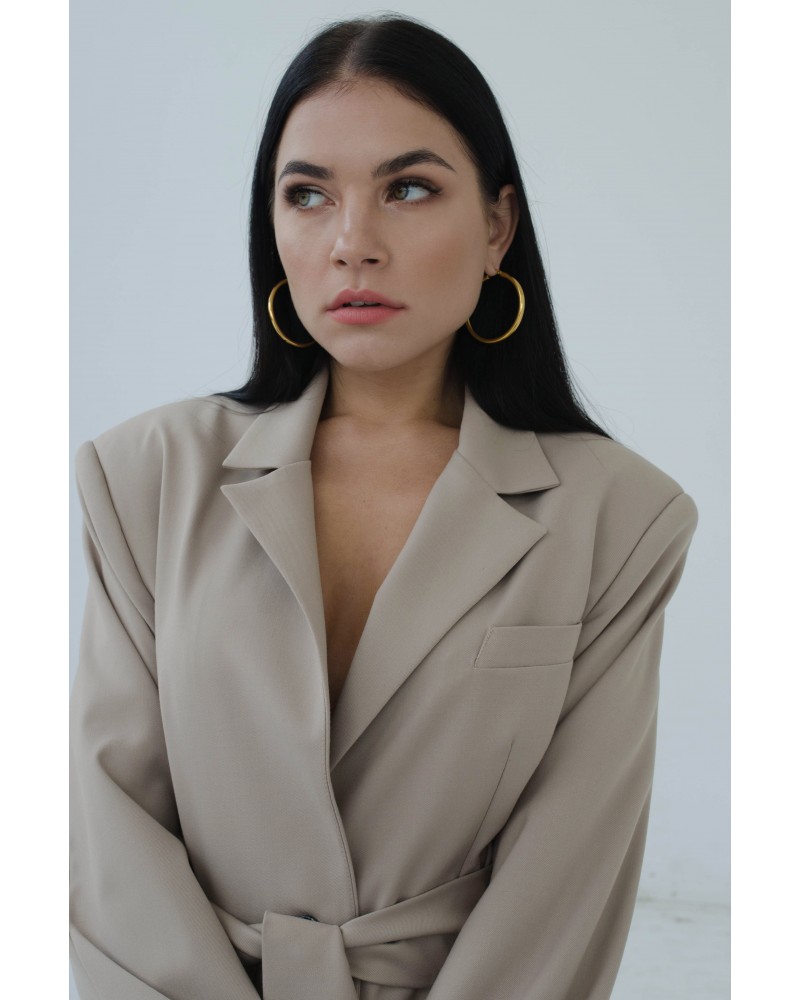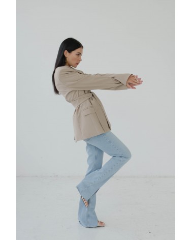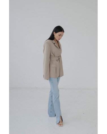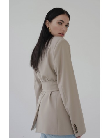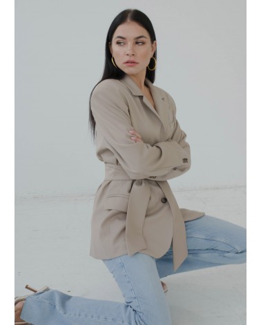 Marynarka wiązana o dwóch sposobach noszenia - z paskiem lub bez. Marynarka o męskim kroju z szerokimi ramionami, to bardzo modny dodatek do wielu stylizacji. Można ją nosić rozpiętą lub przewiązaną paskiem. Świetnie wygląda do jeansów, jak i krótkich spodenek.