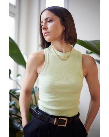 Bokserka w przepięknym pistacjowym kolorze, okrągłym dekoltem i dopasowanym kroju. Bokserka będzie idealną bazą do wielu stylizacji. Świetnie sprawdzi się do białych lub kremowych spodni.