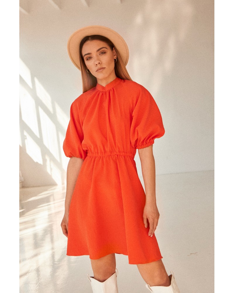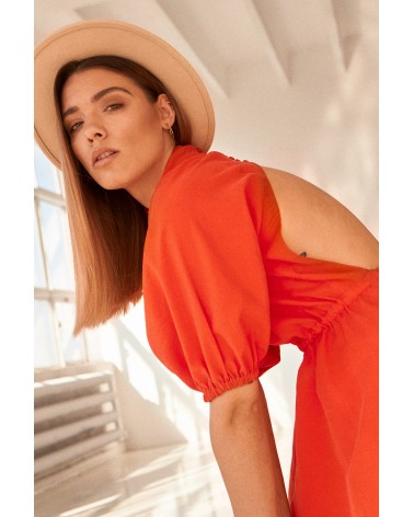 Wykonana z przyjemnego jedwabiu. Jej dużym atutem jest ozdobne wycięcie na plecach, które wyróżnia tę sukienkę z pośród innych. No i na koniec kolor! Piękny, soczysty pomarańcz.