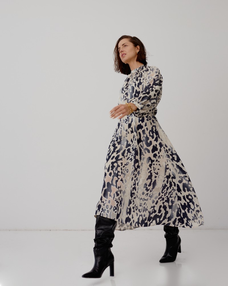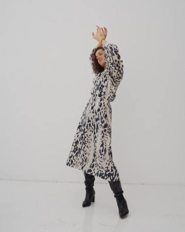 Przepiękna sukienka w bardzo oryginalny i modny wzór. Ma świetą długość zarówno do kozaków, jak i sandałek. Podkreśla talię dzięki delikatnej gumce w pasie, a bufki przy rękawach podkreślają kobiecość. Z tyłu delikatna łezka oraz guzik.